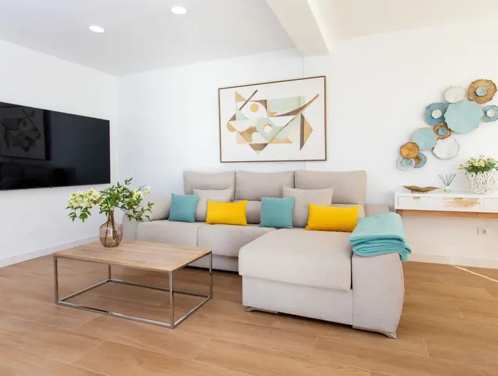 La sala de estar incluye un sofá cómodo, perfecto para relajarse en un entorno acogedor y luminoso.
